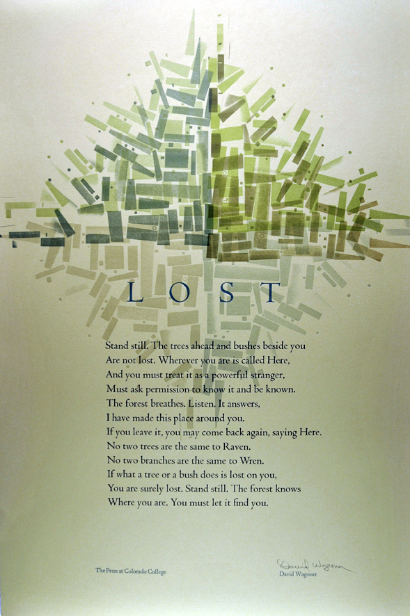 While working on a recent post, I delightfully stumbled upon this magnificent poem by David Wagoner, entitled “Lost”. Here it is illustrated beautifully by the Press at Colorado College for their exhibition, “The Printed Poem, The Poem as Print”.